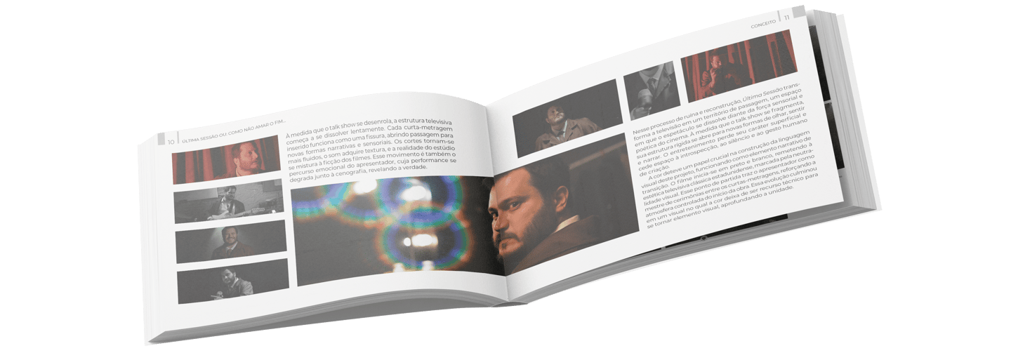 A Última Sessão is a feature-length film composed of four independent short films, each with its own story, tone, and visual identity — all framed by a fictional talk show that binds them together. This hybrid format required a document capable of honoring both the individuality of each short and the cohesion of the whole.